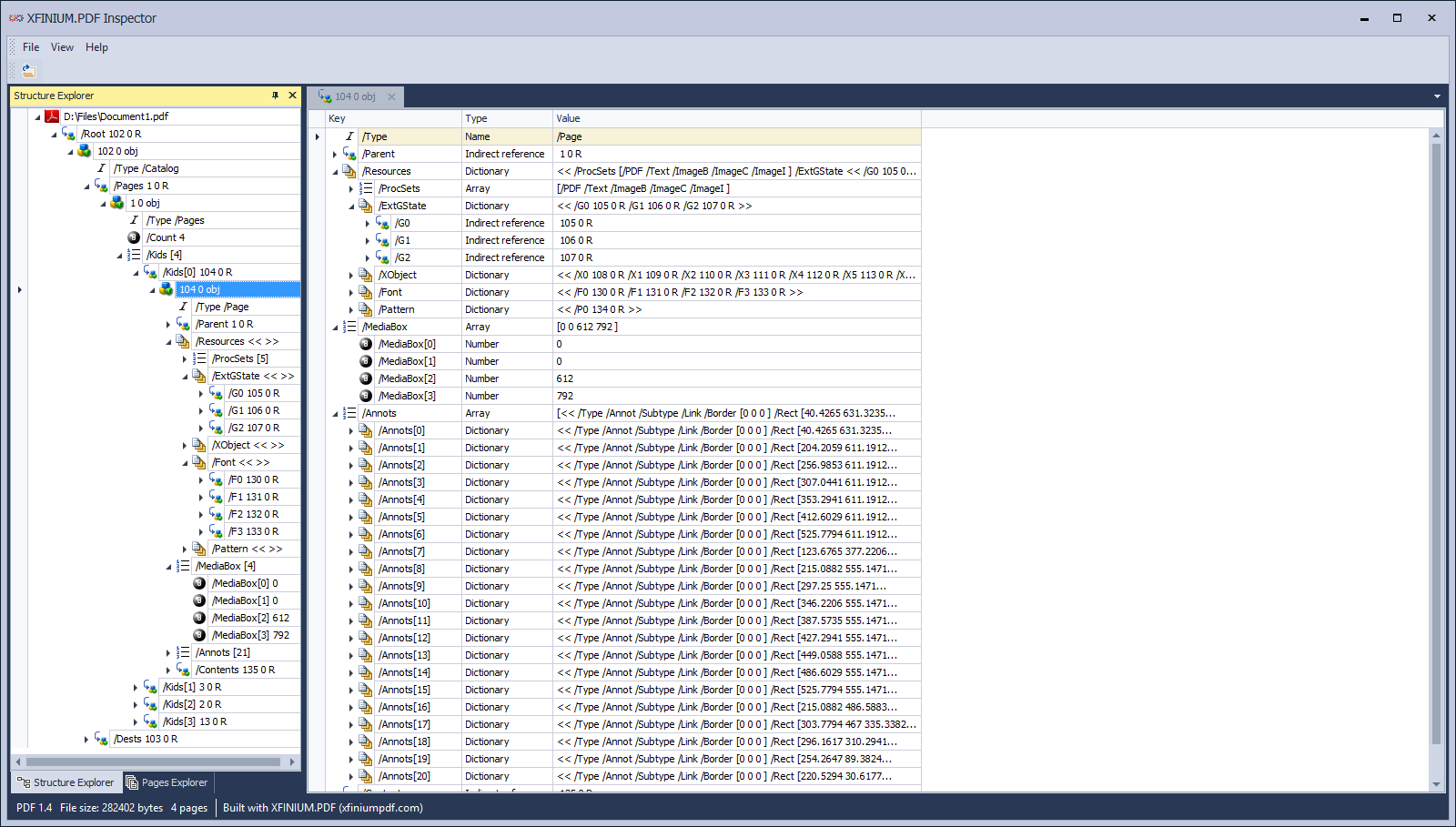 The cross reference explorer displays the list of objects in the PDF file with the details for the selected object.